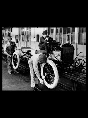 The Ford Motor Company invented the moving assembly line under the leadership of the iconic Henry Ford. The assembly line started rolling for the first time on December 1st, 1913, 105 years ago. Read the article to learn more about the assembly line, and our collection of Ford Artwork and Memorabilia.