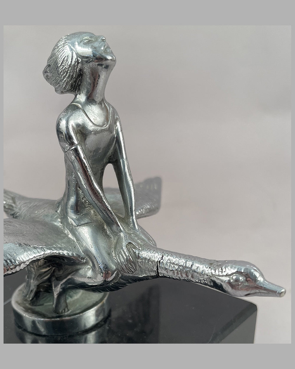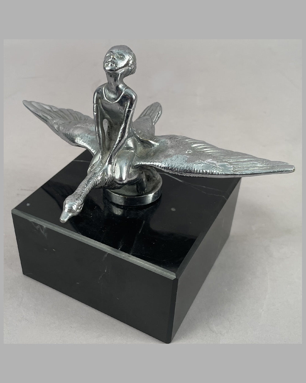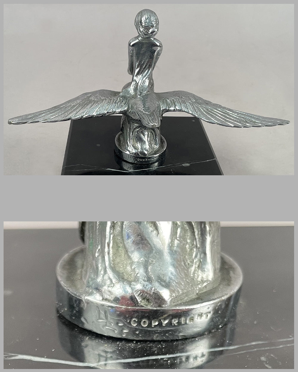 Prewar, bronze chrome plated, mounted on marble base, 8” wingspan x 6.75” high including marble base, signed L.L. and copyright marking on mascot base, A+ cond.