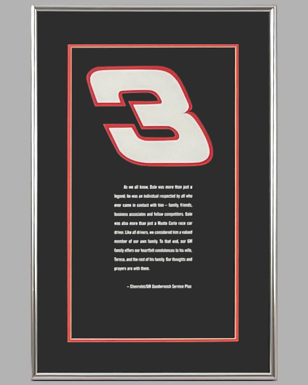After the Daytona 500 in 2001 when Dale Earnhardt Sr. was killed in his #3 racing Chevrolet, framed and matted, 13” x 19.5”, A+ cond.
