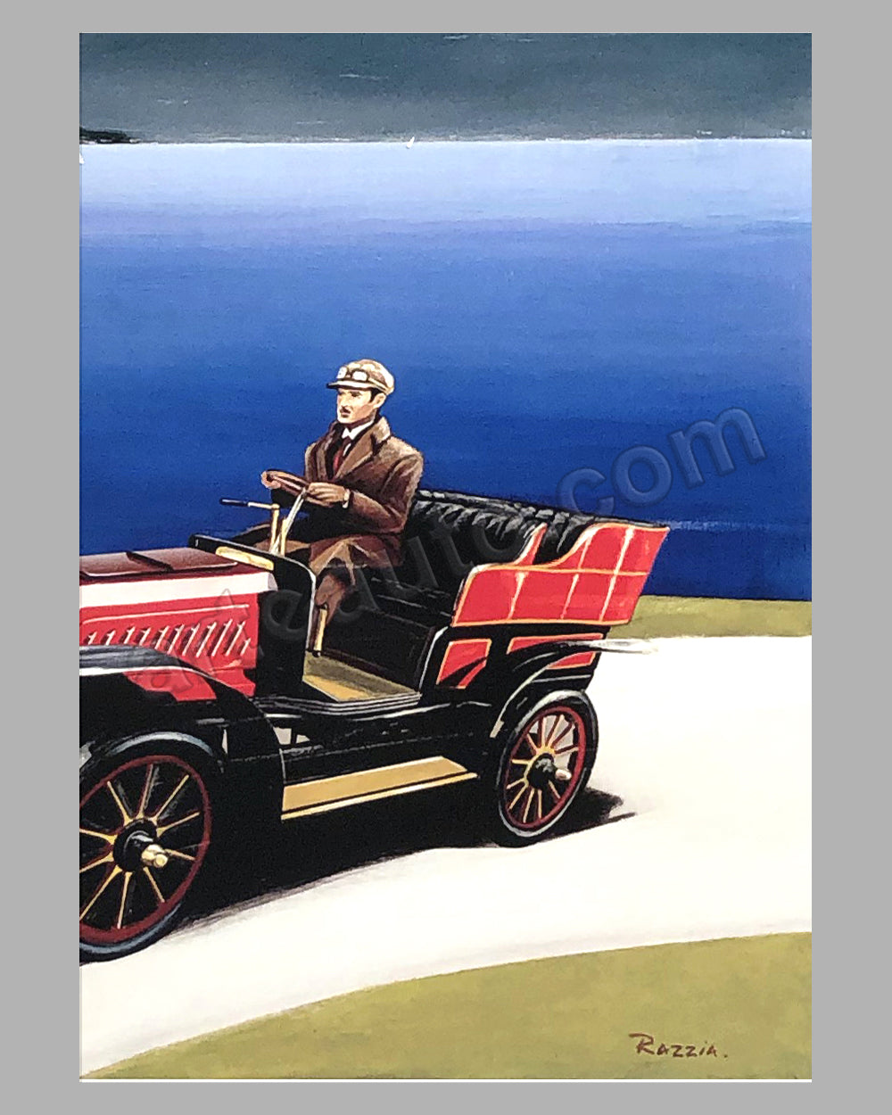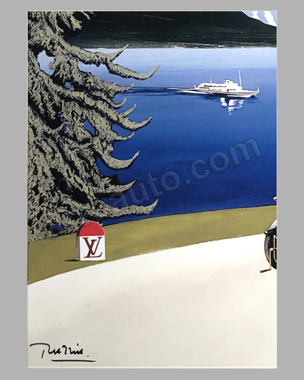 Commissioned by Louis Vuitton who sponsored the event in 1996 for vintage cars driving in Switzerland in proximity of the lake and Geneva, hand signed by the artist. 26.5" x 35" including linen backing, A+ cond.