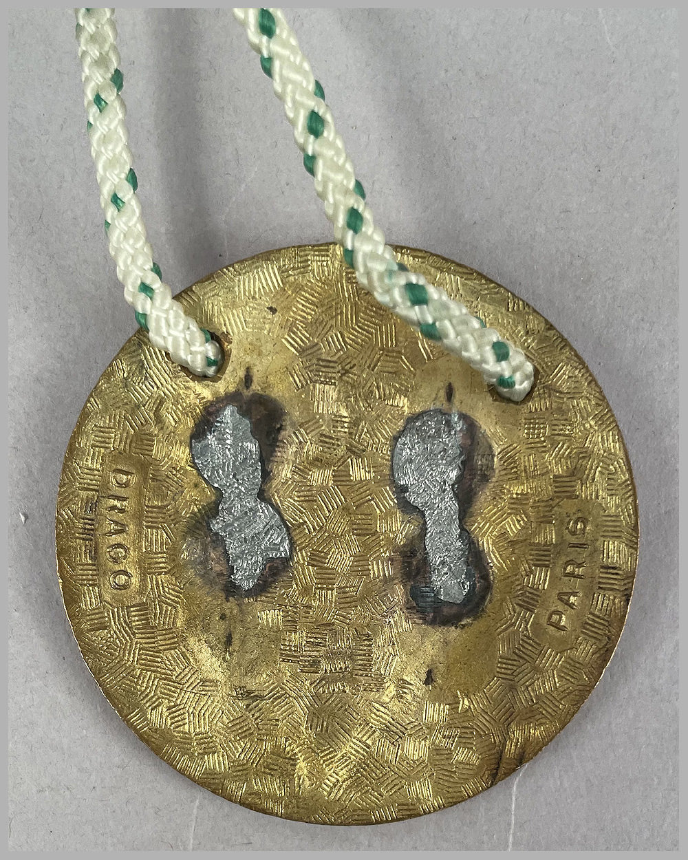 For controleur #373, brass and enamel by Drago, Paris, 2.1” diameter, with neck rope, A- cond. (retouch on back).