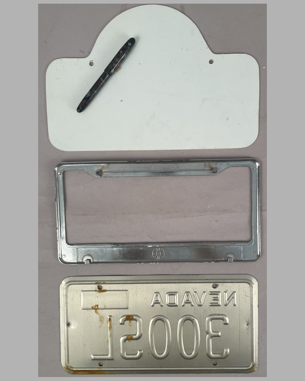 1) License plate frame from the Gulling Group, metal, painted. 2) Nevada 300SL license plate, last used in 1980, aluminum. 3) 24th International Convention 1992, rally plaque for the event organized in Washington State by the Gullwing Group International, plastic. A- cond. (used, minor wear). lot of 3.